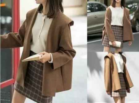 5、穿上比较显瘦的中长款驼色大衣,这款不管是秋冬,还是春季都可以穿上哟!不管是单穿或是搭配在各种大衣风衣里面都好看哦,外上衣的轮廓就洋气,圆领+V领,特别不同,外上衣的版型真的还挺时髦的,单独搭配牛仔裤都是好看的!简单的黑色和裸色。