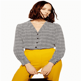 墨蓝色搭配金**,相比于黑白更显精致与靓丽,且蓝色的饱和度较低,更能突出优雅的气质,搭配高腰裤有效勾勒优美的**与腿部曲线。