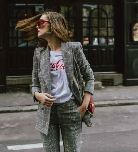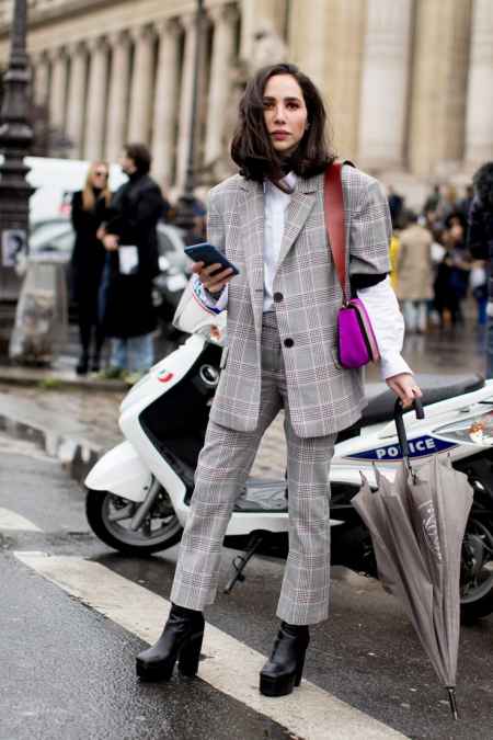 灰色格子西装长裤的套装最具有成熟沉稳的中性调调,搭配高跟鞋来穿,打造复古情怀又具有气场,非常适合职场宝宝们哦。