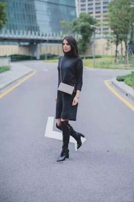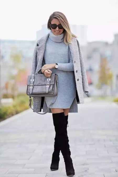 过紧的针织裙与长靴搭在一起会降低时髦度,反而慵懒的oversize针织连衣裙和长靴的搭配符合上**紧的黄金法则,长靴遮住小腿肉肉把纤细大长腿完美体现,能让你看起来瘦一圈!