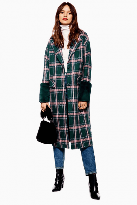 粉绿格纹大衣+白色高领针织衫