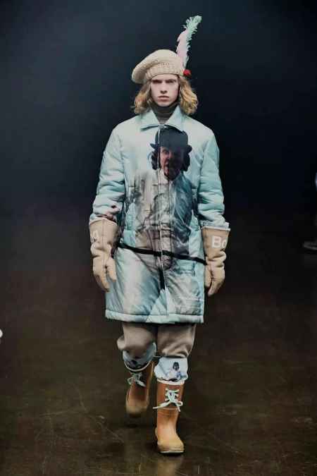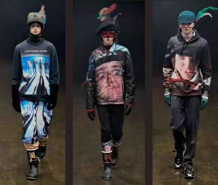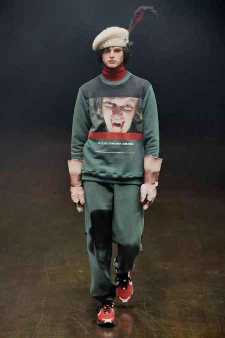 在诸多印花中,大幅的人像印花是最重要的看点,汲取自经典影片《发条橙》的灵感,营造出怪诞、神秘而美好的诱惑绮丽形象,让男孩的复杂性格与内心表露于服饰之上。