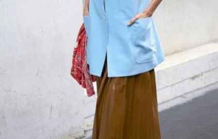 小西装+半身皮裙,皮质的百褶裙和长款西装外套搭配更好,颜色亮一点更吸睛。