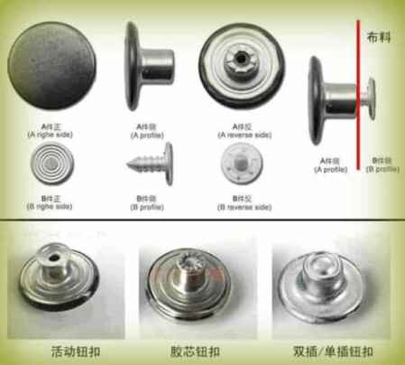 我们先来看下牛仔钮扣的构造及组成的,如下图:套牛仔钮扣是由上面的扣子(A件)和下面的钉子(B件)两部组成,而扣子又是由钮面+钮底组成,从钮底来分的话可分为活动钮扣、胶芯纽扣、单插或**钮扣。