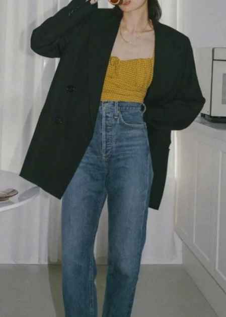 除了直接穿搭,**黄波点上衣作为内搭也是十分合适的选择,尤其是搭配黑色的外衫与牛仔裤,黄蓝黑的感觉甜美而又不失小清新,相比于有点裤裤的黑白配,**黄搭配黑西装更显得气色极佳哦~