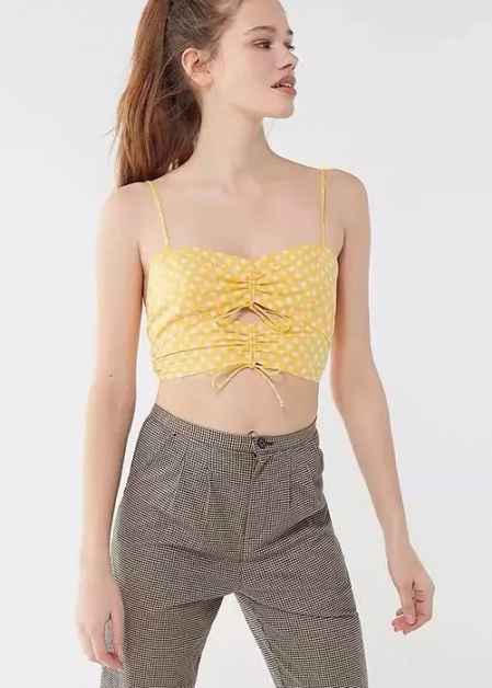 波点的元素总能带来又复古又甜美的效果,更重要的是还能让任何颜色都变得更加柔和,也能更加衬托肤色哦。带有皱褶细节的**色上衣搭配波点,就如同糖果一般甜美,如果是有袖的上衣,可以选择带有荷叶边的款式,如若是吊带衫就更性感了。