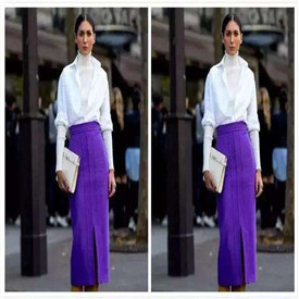 紫色是一种富贵色,但是在时尚界比较少用,因为这种色彩特别挑肤色,也很难搭配,所以在时尚T台上的紫色大多为真丝绸缎质料,或者是一些毛类单品。若是全身穿浅色系服装,无论是在腰间系上紫色皮带,或是配上一只紫色小包包,这种以配件来衬托穿搭的方式,对整体造型有加分的作用。