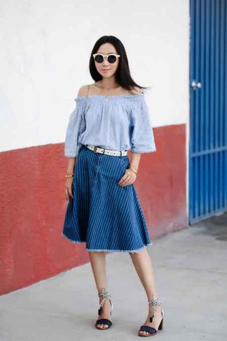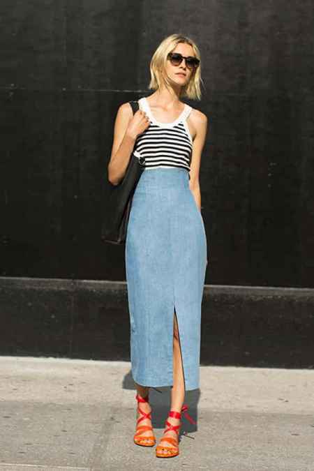 背心或者T恤搭配开衩牛仔裙,率性随性之余也不失精致小细节。
