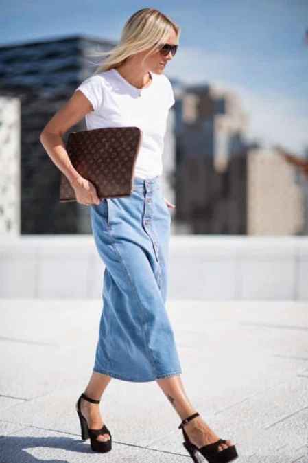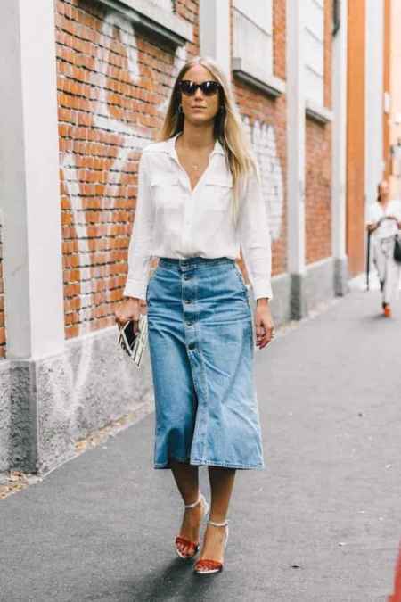 纽扣装饰的牛仔半裙似乎火了一个世纪,时髦、百搭、好穿,都是它的形容词~