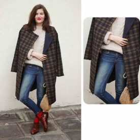 格子呢子大衣+牛仔裤