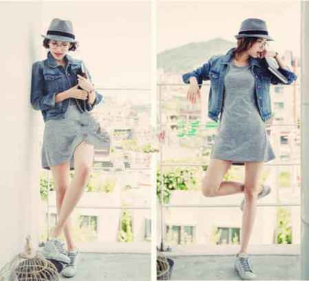 搭配看点:短款牛仔外套能够提升腰线,让下半身的比例更加修长。蓝色与灰色的搭配,非常的雅致,同时也不乏时尚感,舒适的T恤连衣裙很好的修身身材同时很有街头休闲范儿。不管是搭配白球鞋还是平底鞋都很有时尚气息,礼帽和墨镜让整体造型吸睛指数直线上升,这样的搭配不论是出街还是周末和闺蜜聚会都十分适合哦。