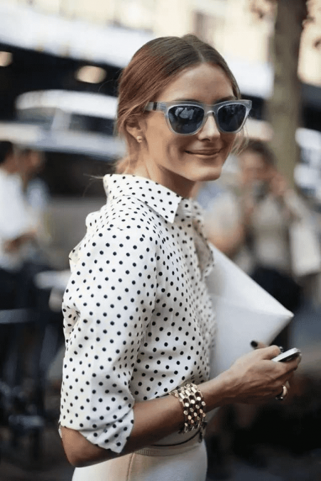 白色波点衬衫,搭配金色首饰,俏皮的波点打破了白衬衫的束缚感。