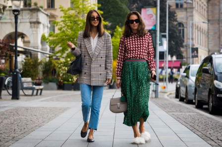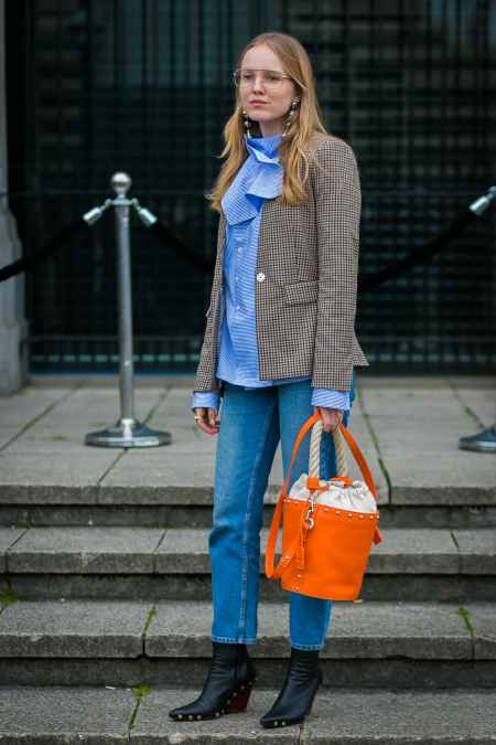 今年复古西装多为咖啡色或者浅棕色的格纹,和牛仔裤的蓝色形成冷暖对比色,比较容易打造视觉冲击感,瞬间吸引眼球哦。