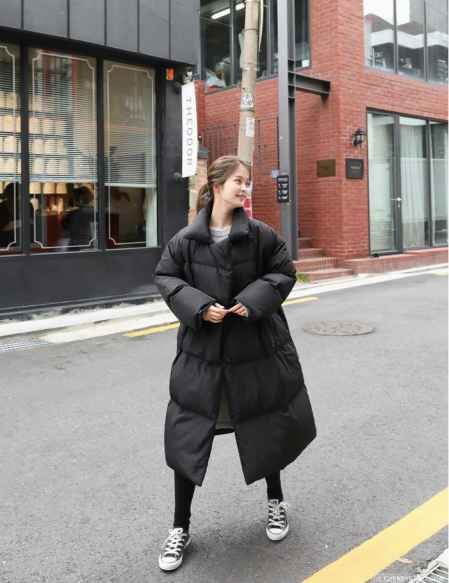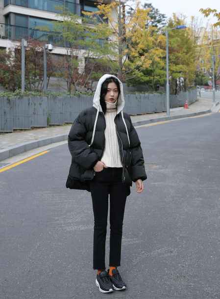黑色面包服配内搭白色毛衣,全身黑白造型是永远不会出错的,而且经典黑白配还能打造简约的大牌范儿。帅气的色调带有中性的味道,上宽下窄的廓形又能塑造小鸟腿,不仅时髦还很显瘦哦。