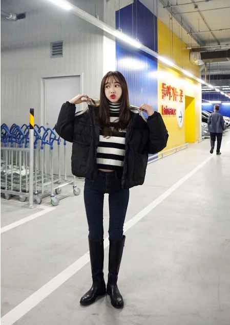 黑色面包服里面穿上黑白条纹的毛衣,瞬间就能吸引眼球,条纹是最能打造视觉冲击感的元素,所以即使是简单的黑白色调也能轻松帮你脱颖而出哦。