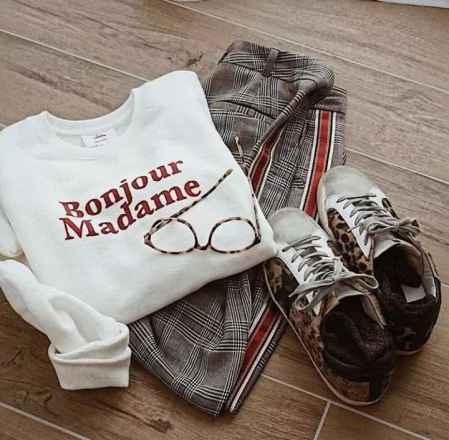 前几天发运动元素的文章时,格纹运动裤那张图片中的法语卫衣就引起了读者的注意,这件卫衣是**品牌Sezane的,上面写的是“你好,女士”。