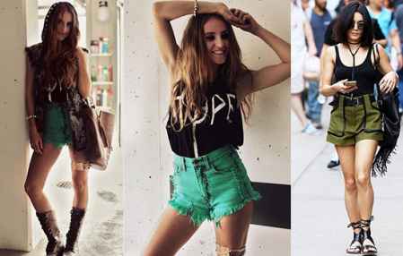 选择中腰修身的军绿色短裤和黑色T恤搭在一起会有一种威严的感觉,整体是非常帅气的。配饰上简单的戴一副墨镜或者黑色的帽子增添了不少阳刚之气,很潇洒的感觉,喜欢酷炫穿搭风格的朋友可以尝试此穿法。