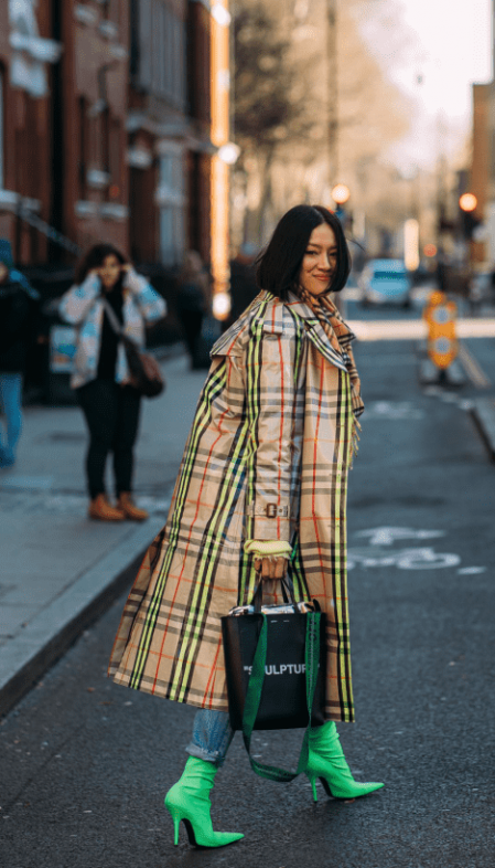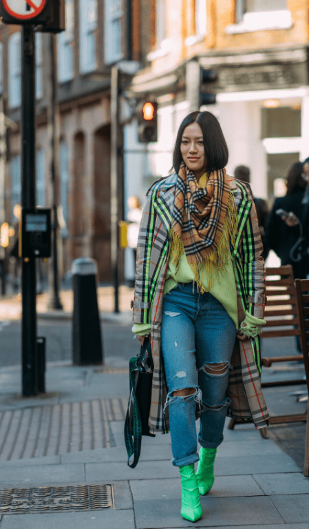 荧光色元素给整个造型带来街头大胆的时尚气息,选择与外套同款格纹的流苏围巾,浓郁的饱和度带来一丝暖意与复古,有效中和了荧光与破洞元素的不羁,多出一丝飘逸的女人味。