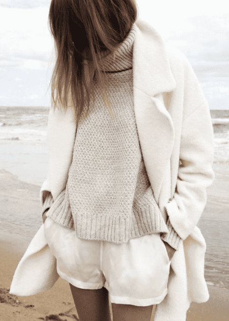 白色呢子大衣+灰白色针织高领毛衣+白色灯笼短裤