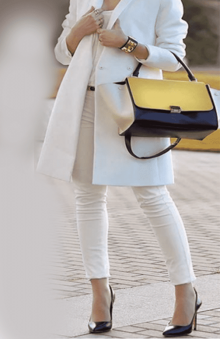 西装式样裁剪的白色呢子外套充满职场女性的知性气场,上衣低领的设计展现出柔**雅的锁骨与脖颈线条,散发出甜美而清新的女人味。搭配一双简约的黑色高跟鞋与稍显夸张的亮色拼接手包,便足够干练大方而不失淑媛气质。