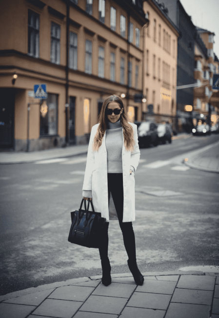 白色呢子大衣+浅蓝色高领针织衫+黑色小脚裤+黑色短筒靴