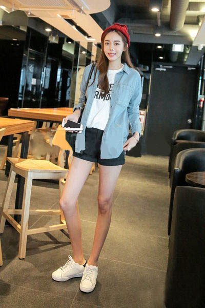 搭配看点:浅色的牛仔衬衫,清新怡人的浅色风格,带些怀旧的感觉,很有文艺范魅力,内穿白色字母T,**再配上黑色短裙,露出性感长腿,穿上小白鞋,突出简约干净气息。