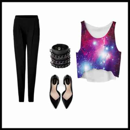 全套搭配:黑色哈伦裤+**波浪剪裁背心+黑色尖头高跟+黑色锁链皮质手环