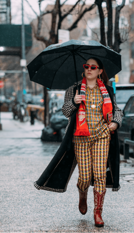 黑白红的配搭经典大气而不失气场,内搭选择**格纹西装套,强烈的色彩冲击充满了街头涂鸦的绚丽。