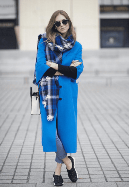 湖蓝色长款大衣搭配蓝黑格纹围巾