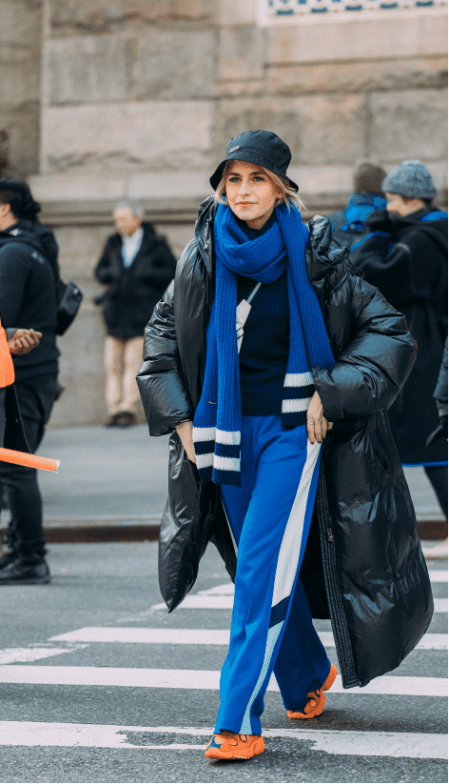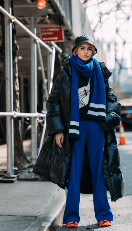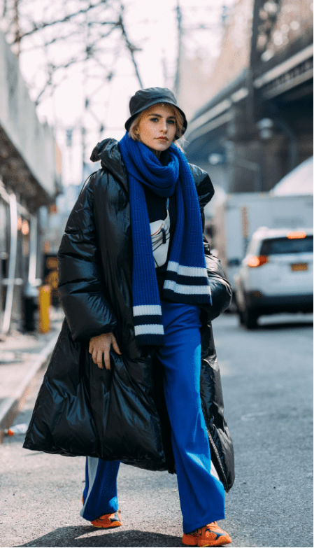 黑色的长款羽绒大衣兼具保暖与浓浓的街头时尚,搭配运动风的蓝色围巾更增添飘逸。