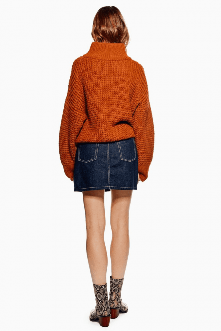 高腰牛仔短裙+橘色宽松高领针织毛衫