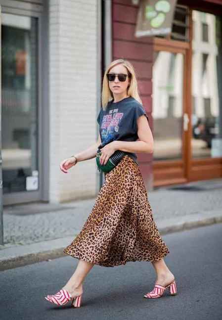 黑色T恤可以是简约优雅的,搭配的时候,中裙也有各种各样的选择,明快的颜色可以添加一丝轻盈的夏季感,给人以减龄的效果。