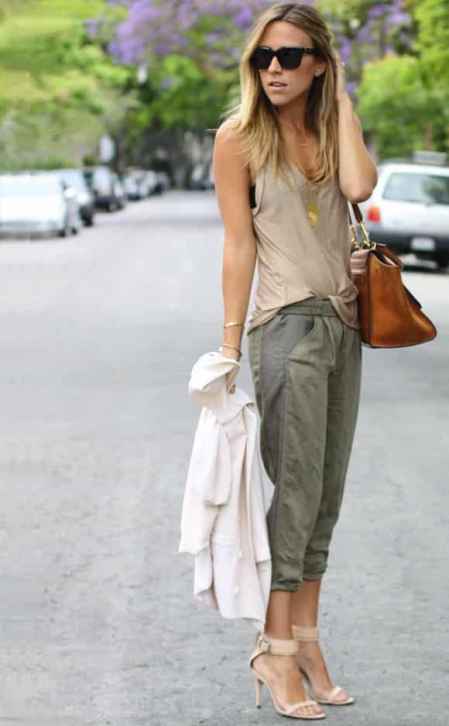垂坠感十足的卡其色背心搭上酷酷的橄榄绿休闲裤,全身上下散发一种霸气十足的明星范儿,时尚潮流感满满,喜爱休闲帅气风的女生可不要错过哦。