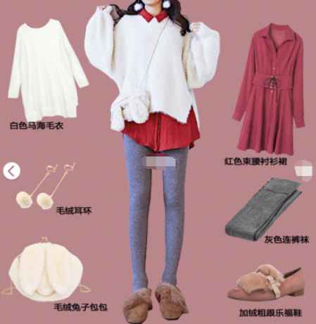 红色的束腰衬衫裙穿在白毛衣的里面,露出一点裙摆,好看又俏皮,下面穿一件加绒的灰色打底裤保暖又显瘦,你也可以用**的毛绒绒的耳饰和兔子包包做点缀,美美的**风的装扮就完成了~~????