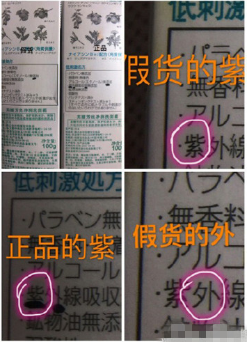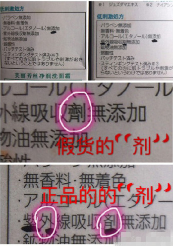 继续观察字体,第四行中“紫外线吸收剂”中“外”和“剂”两个字,正品的“外”字右边那一点是凸出来的,而假货没有凸出来,假货的“剂”字比真货的要复杂很多。