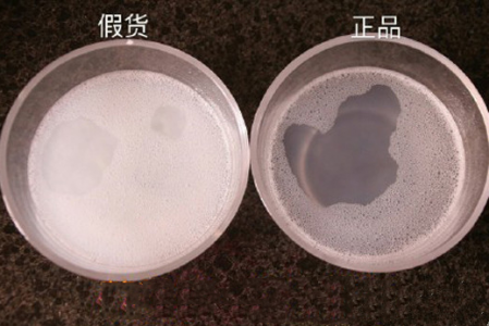 将搅拌均匀的水放置一个小时,可以看到正品水中的泡沫基本上消失了,只剩薄薄的一层,而假货水中还有很多泡沫。