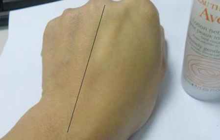 用彩妆工具在手背上画出几条线条,用洁面乳按摩、擦拭,可以看到擦干净后的手背上彩妆大部分被卸除,可见它的清洁力不错。这个是为了检测清洁力,平时使用当然要先卸妆再用洁面乳,而且浓妆时需重复使用两次洁面乳。