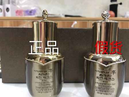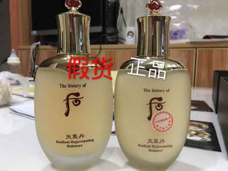 正品水颜色较浅,呈现出鹅**,而假货是偏橘红,其次,气味上,不管是水还是乳,还是霜,都不一样,正品是那种一闻就非常高端的味道,具体什么味道,我无法形容,只知道**,是应该这样的感觉,而假货是那种小编小时候从老奶奶身上闻到的一块钱一袋的“雪花膏”的味道,一闻就觉得低劣,假,再者,大家观察瓶子有什么不同吗?对,瓶底一个厚一个薄。