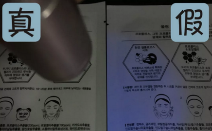 正品的Jm蜂蜜面膜内包装,经过照射之后并没有荧光反应。而假货的Jm蜂蜜面膜内包装,经过照射之后出现了荧光反应。