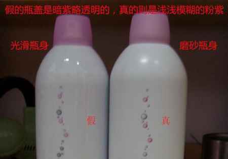 真的依云喷雾的瓶盖是浅浅模糊的粉紫色,瓶身是磨砂质感,而假的则是略透明的暗紫色,瓶身是很光滑的。