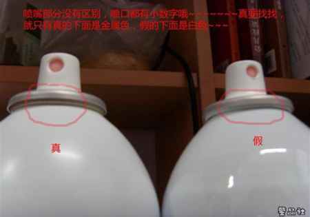 真假两款的喷嘴没有区别,只是喷嘴下面的瓶口一圈颜色不同,真货是淡黄的金属色,而假货是白色的。