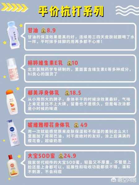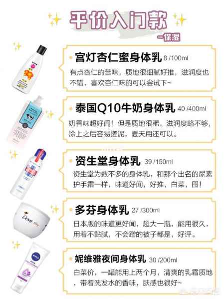 主打保湿的平价款身体乳很多,这里选择比较热门的,而且价格都好美丽,多用点也不心疼。很多干皮,容易产品皮屑的人都适合保湿款。