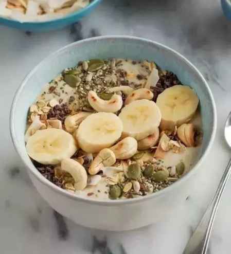 食材:2个香蕉切片、1/3杯杏仁牛奶、1/4杯燕麦、腰果、椰子丝带、南瓜子、葵花籽、可可、蜂蜜或坚果黄油