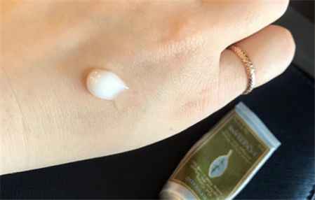 1、把双手洗干净,并擦至八分干,并挤出一粒黄豆大小的护手霜在手背上。