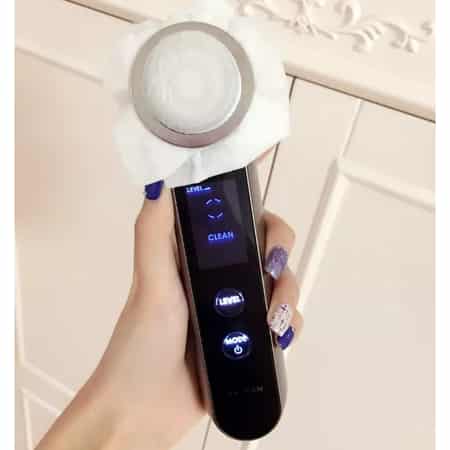 将化妆棉固定在美容仪上,然后将清洁用的化妆水滴到化妆棉上将其浸湿。按美容仪开关,第一个模式就是清洁模式,然后按上面的level键,来调节强度。一开始是RF预热模式,半分钟后就变成清洁+震动,中间有提示音,一个清洁模式会有6次循环。