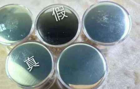 大家看,四个真货的盖子中间放了一个假货的瓶盖,对比相当明显了,主要在颜色上,正品的为标准的银色,颜色较亮。假货的颜色则较为暗,对比下十分明显的区别。
