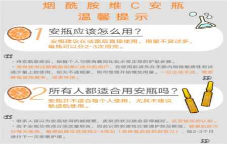 没有使用过烟酰胺和维C的姐妹们,在使用前请先在手腕内侧做敏感性**或少量上脸使用,如无不适现象,则可满满开始增加用量,一旦出现不适,需要降低使用频率,或者停用。