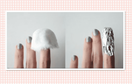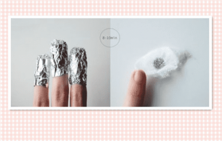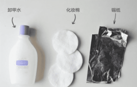 用化妆棉包裹住涂了甲油的指甲,最后用锡纸包裹住尤妮佳化妆棉,所有的指甲都做一样的处理。