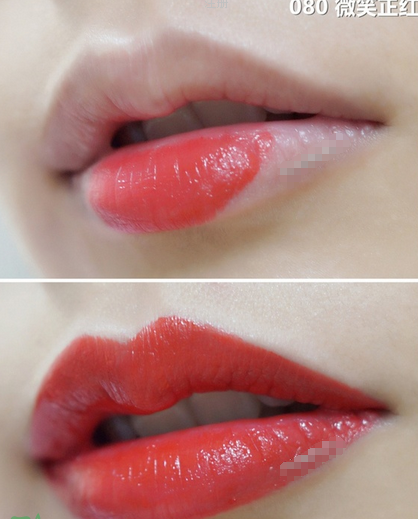 080是春晚火了的色号,080是带橘感的亮红色,比较活泼,带点橙色调调,质地水润好涂。