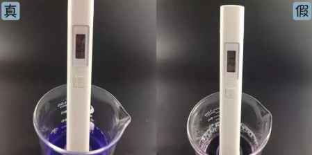 正品溶解性固体总量(TDS) 数值 60-65;假货 TDS 数值 20-25。看起来相差不大,不过也有三倍多。